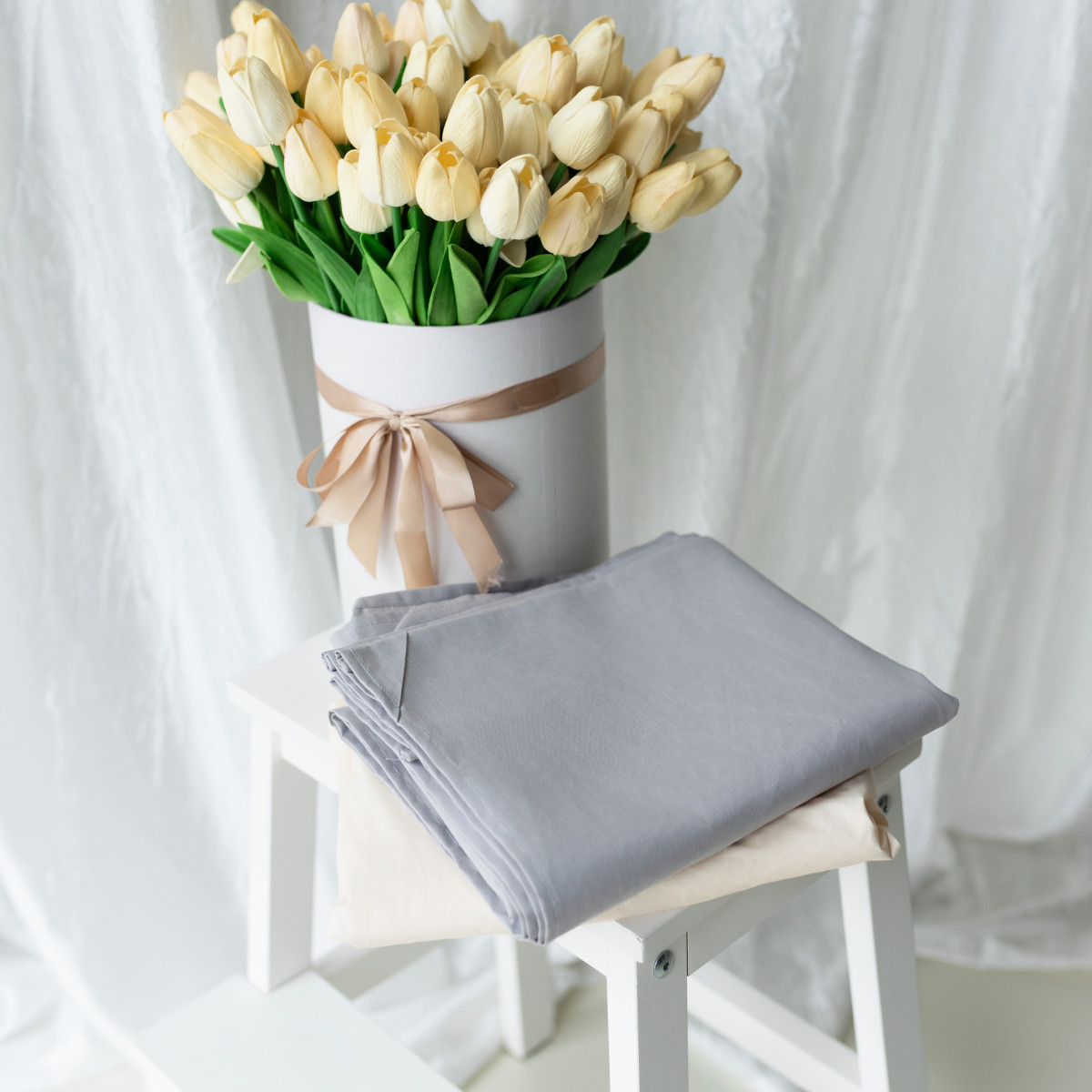Тканина – бязь; Склад – 70% бавовна, 30% поліестер; Щільність – 120 г/м²; Колір – сірий