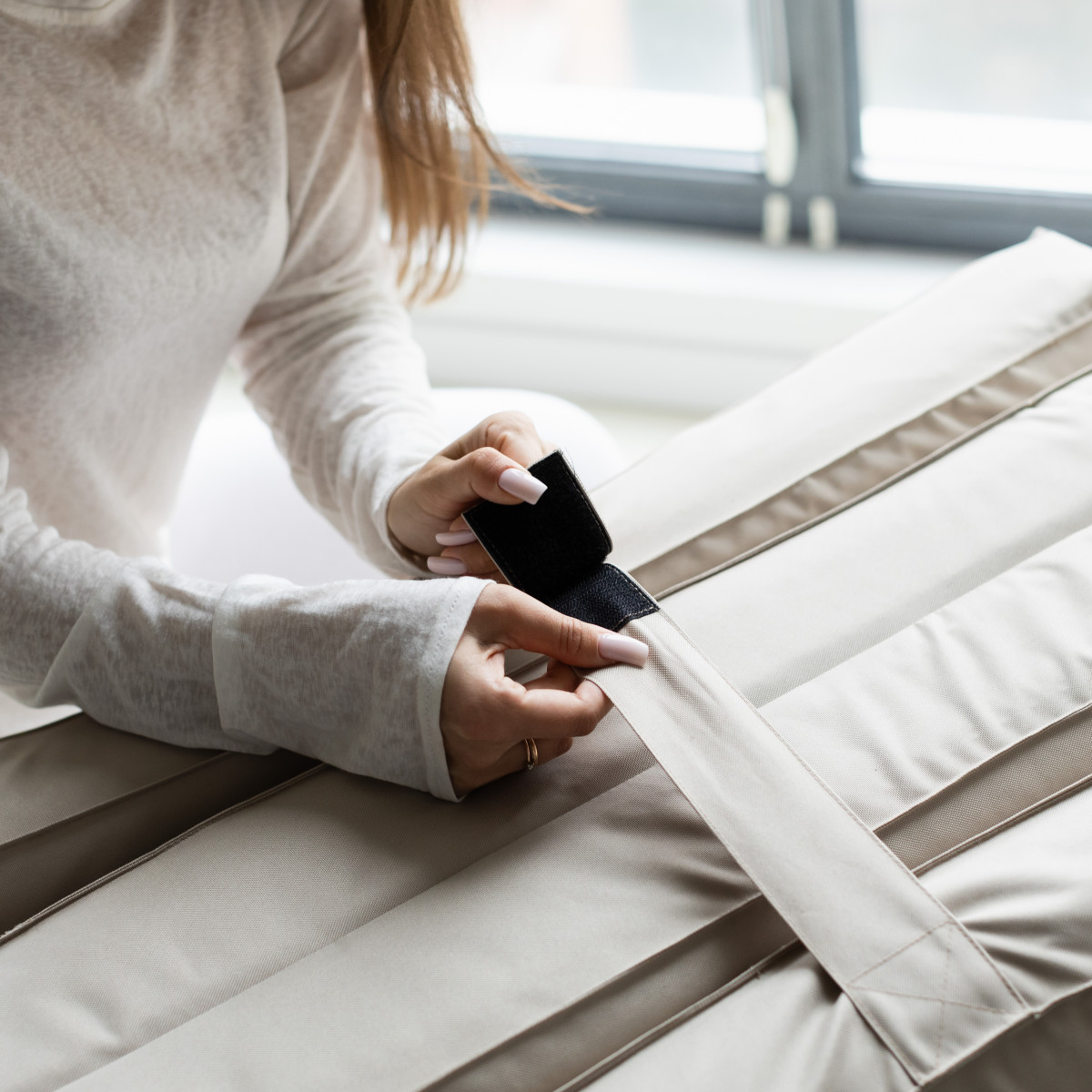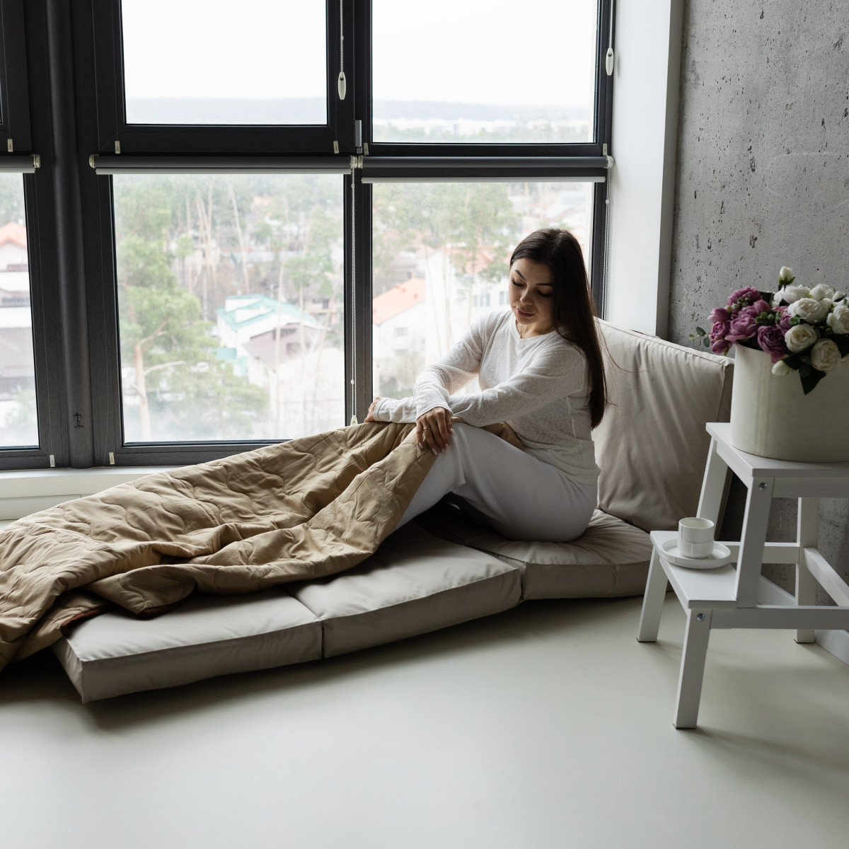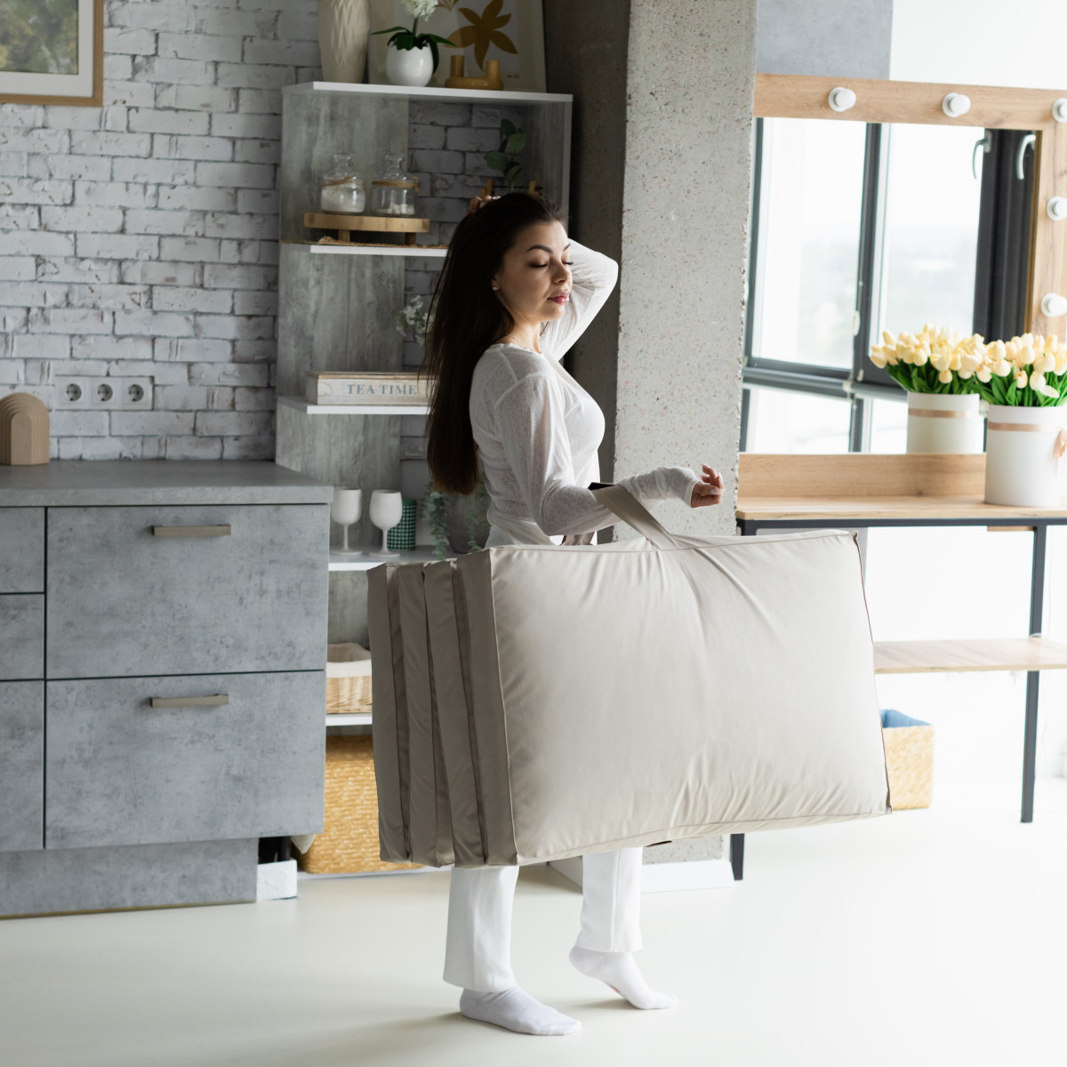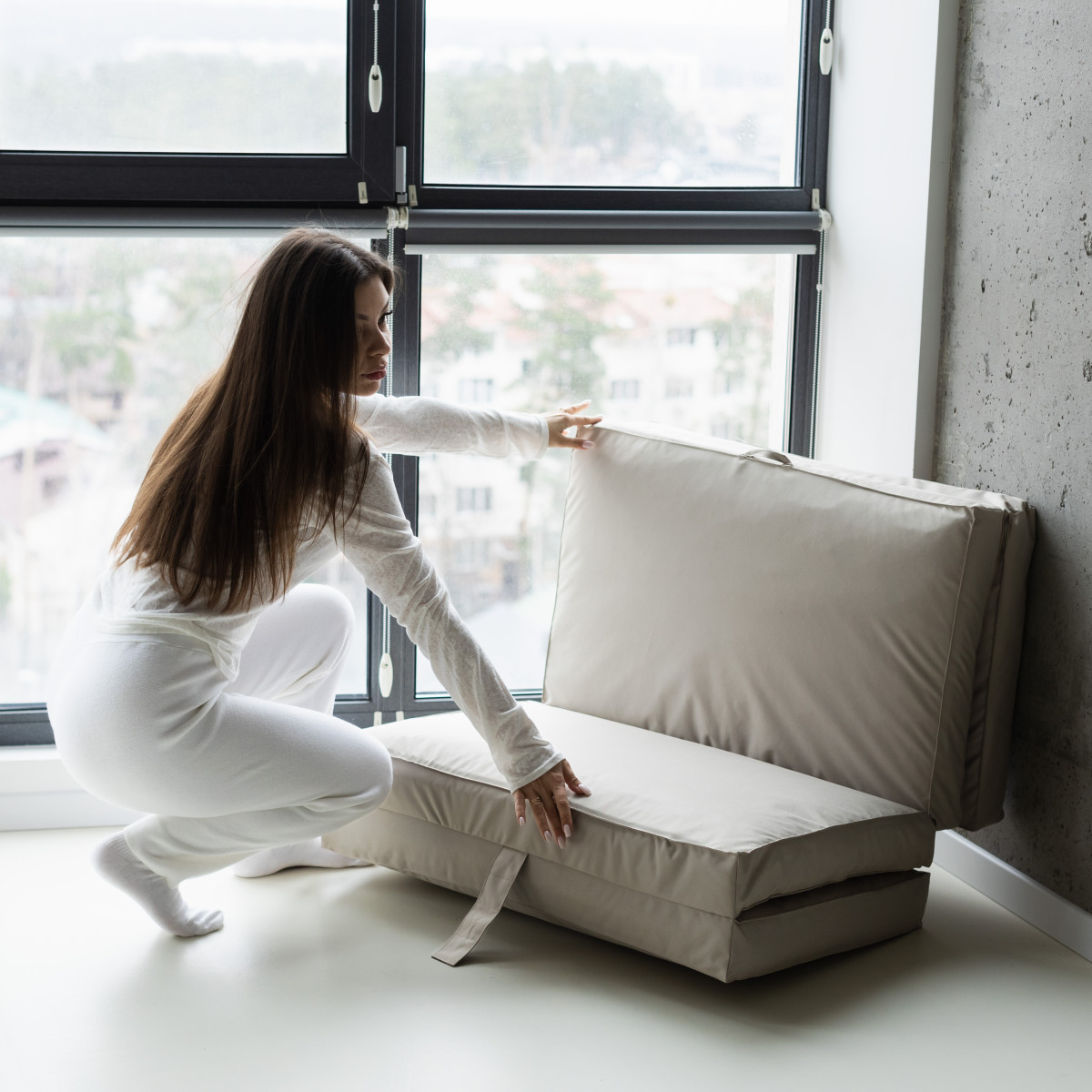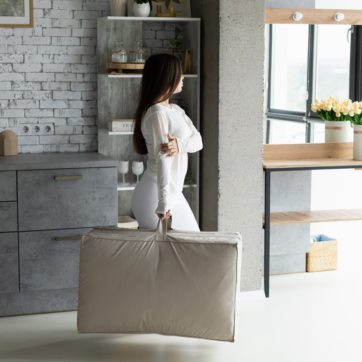 Матраци Flexio складаються в кілька разів і важать трохи більше 3 кг, тож їх легко зберігати й переносити. У шафу, на балкон, у багажник — вони помістяться всюди. А ще їх можна взяти із собою в подорож або просто перенести з кімнати в кімнату — навіть дитина впорається!