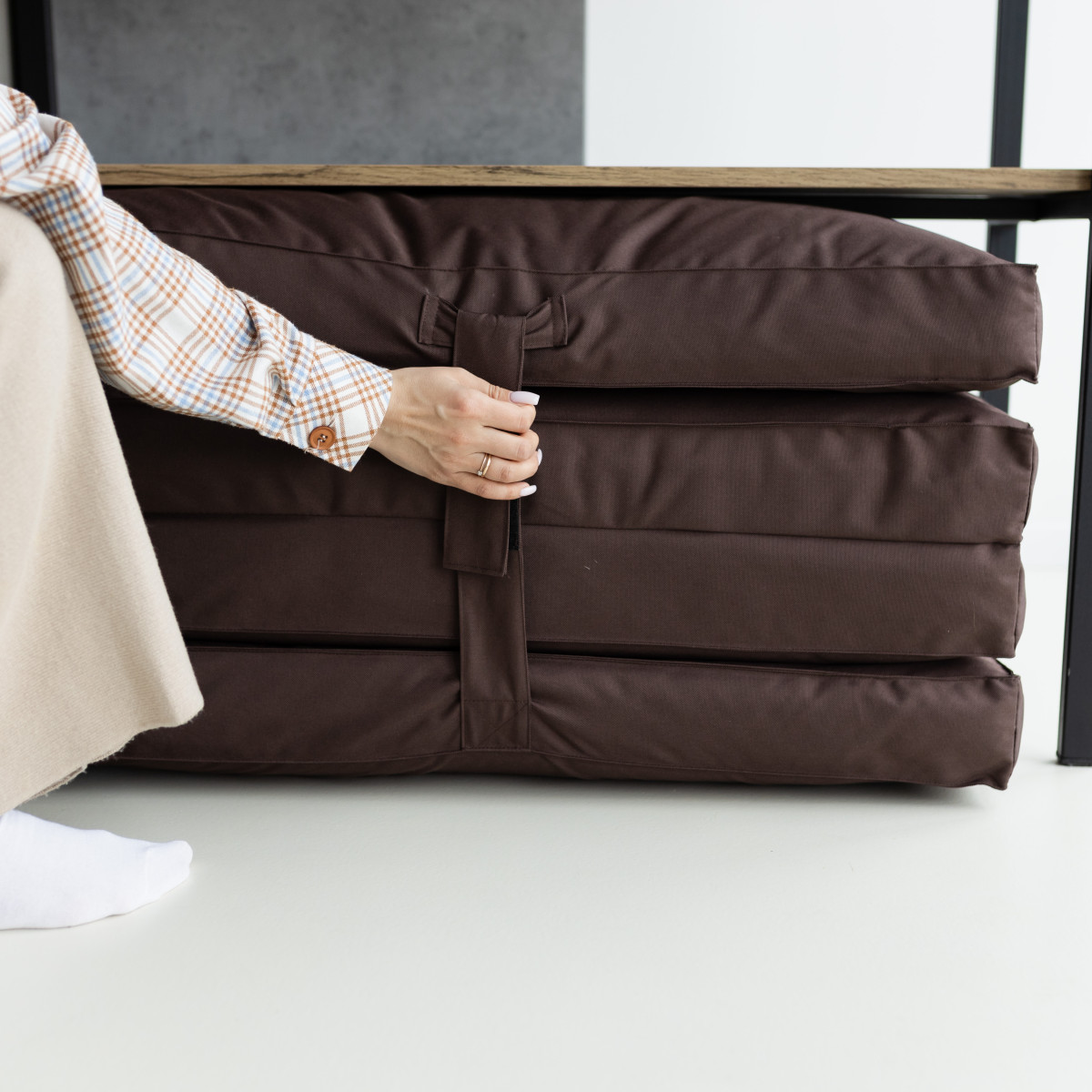 Матраци Flexio складаються в кілька разів і важать трохи більше 3 кг, тож їх легко зберігати й переносити. У шафу, на балкон, у багажник — вони помістяться всюди. А ще їх можна взяти із собою в подорож або просто перенести з кімнати в кімнату — навіть дитина впорається!