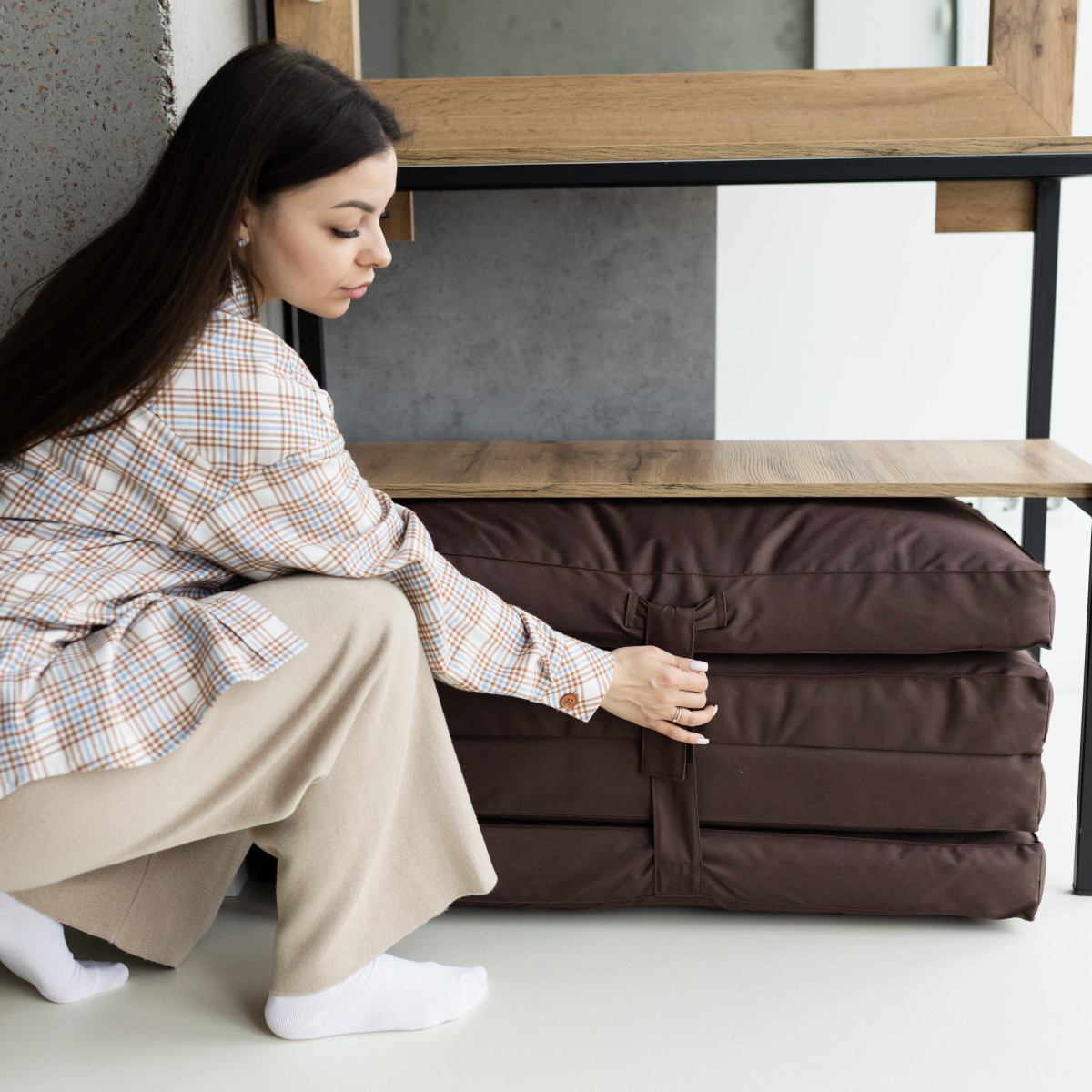 Матраци Flexio складаються в кілька разів і важать трохи більше 3 кг, тож їх легко зберігати й переносити. У шафу, на балкон, у багажник — вони помістяться всюди. А ще їх можна взяти із собою в подорож або просто перенести з кімнати в кімнату — навіть дитина впорається!
