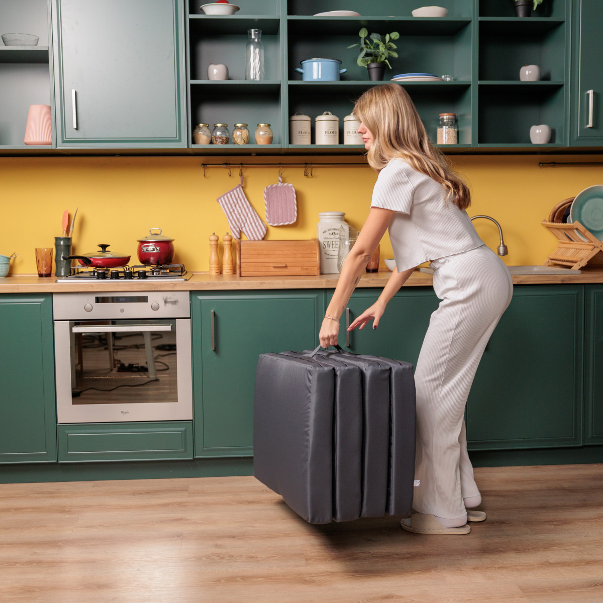 Матраци Flexio складаються в кілька разів і важать трохи більше 3 кг, тож їх легко зберігати й переносити. У шафу, на балкон, у багажник — вони помістяться всюди. А ще їх можна взяти із собою в подорож або просто перенести з кімнати в кімнату — навіть дитина впорається!